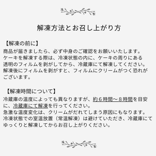 ※ケーキ表面の結露を防ぐ為に冷凍状態で常温に放置することは避けてください。